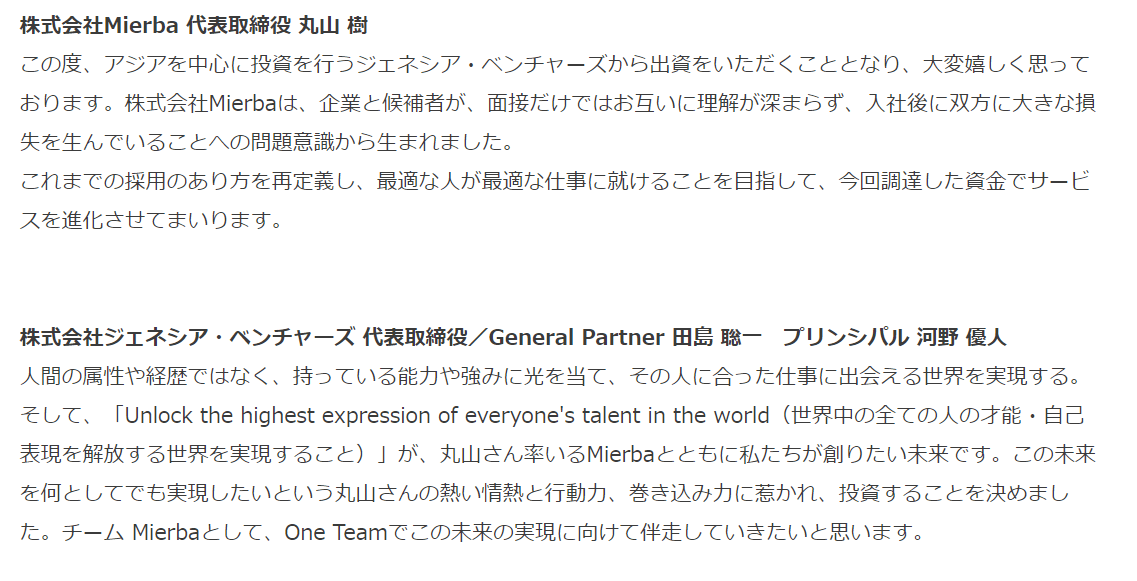 株式会社Mierba(本社:東京都港区、代表取締役:丸山樹、想定時価総額:1億200万円/2021年9月4日時点)がシードラウンドとしての第三者割当増資により5000万円の資金調達を実施。引受先はジェネシア・ベンチャーズやエンジェル投資家等(非公開)。